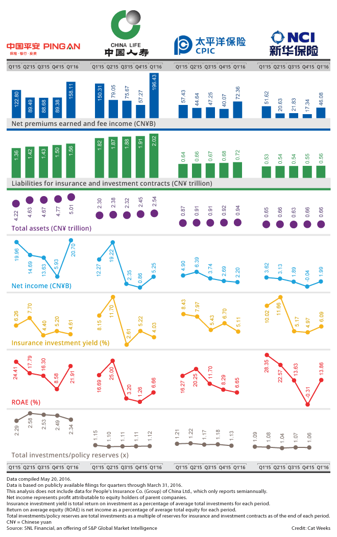 Among the top five listed Chinese insurers by assets, aggregate net profit at Ping An Insurance (Group) Co. of China Ltd., China Life Insurance Co. Ltd., China Pacific Insurance (Group) Co. Ltd. and New China Life Insurance Co. Ltd., or NCI, dropped to 30.14 billion yuan in the three months to March from 40.76 billion yuan a year earlier. Among them, only Ping An managed to avert a decline in earnings, which edged up to 20.70 billion yuan from 19.96 billion yuan..