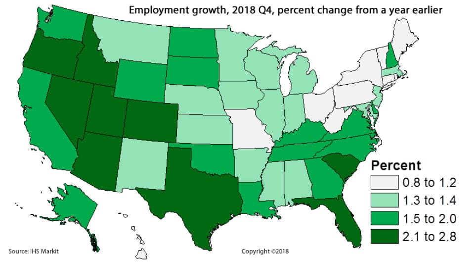 The South and West will have the country's hottest job markets and compete for best in show. Employment growth in the South and West has outstripped the Northeast and Midwest over the last several decades, outside of the dramatic 2008-10 housing correction. Since 2010, the South and West have returned to robust expansion, although the growth dynamic between them is changing. Since 2012, average annual employment growth in the West (2.4%) has comfortably outpaced the South (2.0%), in part because the housing crash and subsequent recovery were most impactful in the West. That region saw much larger increases in construction employment and home price growth from 2012 onward compared to its southern counterpart. Furthermore, the economic damage from the recent oil-price correction was concentrated in the South, particularly Texas, which hampered job prospects there over 2015 and 2016. That trend began to change in 2017, however. The housing recovery in the West is naturally losing steam after years of robust growth. Two key sectors in the West economy, professional and business services and information, also saw hiring slow in 2017, driven in part by a cooling high-tech sector. Meanwhile, the energy industry recovered in late 2016 and was a significant stimulus for the South during 2017.