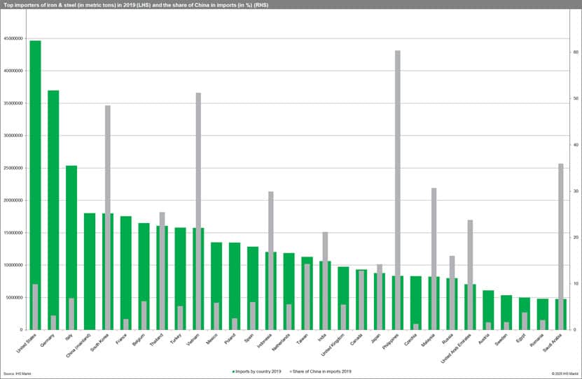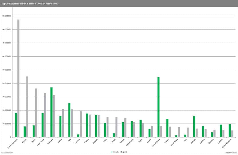China was the world's largest exporter of iron and steel in 2019. The volume of China's 2019 exports was almost double that of the world's second-largest exporter, Russia, and roughly 2.5-times the exports of Japan and South Korea.