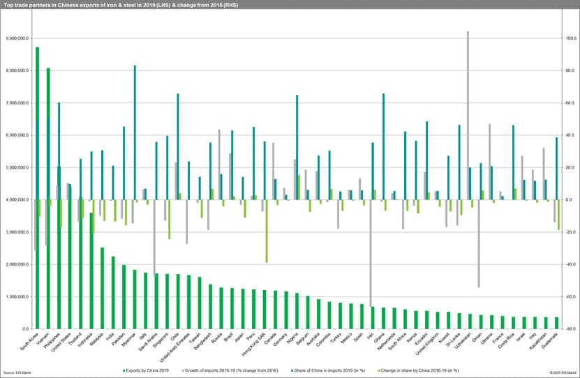 Top trade partners of China in iron and steel exports include South Korea, Vietnam, the Philippines, United States, and Thailand.