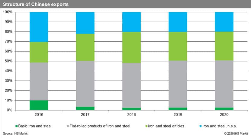 Flat-rolled products of iron and steel clearly dominate Chinese exports and are followed by iron and steel articles. The role of basic iron and steel is decreasing.