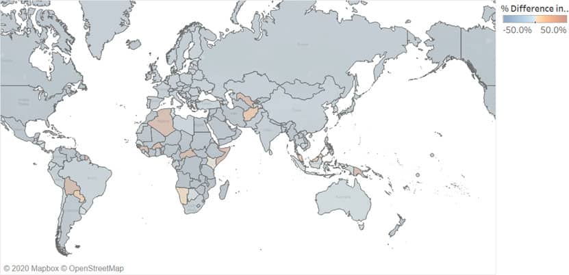 Map 3. Global exports of iron and steel, % change in 2019 from 2018