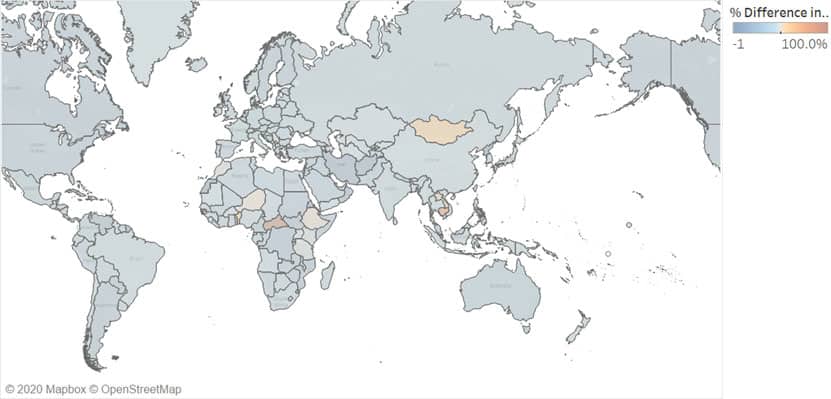 Map 4. Global imports of iron and steel, % change in 2019 from 2018