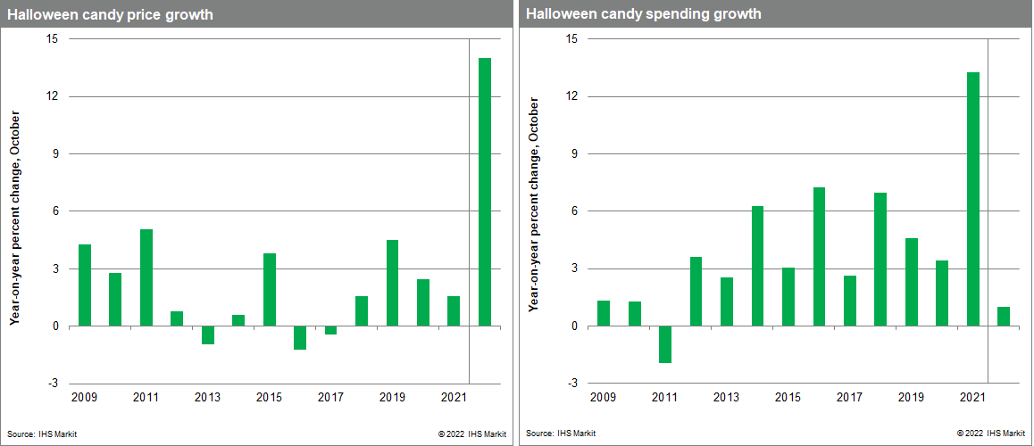As the specter of recession looms large, retailers will be keeping a keen eye on candy sales to gauge the health of consumer demand going into the 2022 holiday season. While 2022 won't top the record set in 2021 for quantity purchased, we still expect a 1% y/y increase in spending, bringing the total spent to a new record of $3.2 billion this October.
