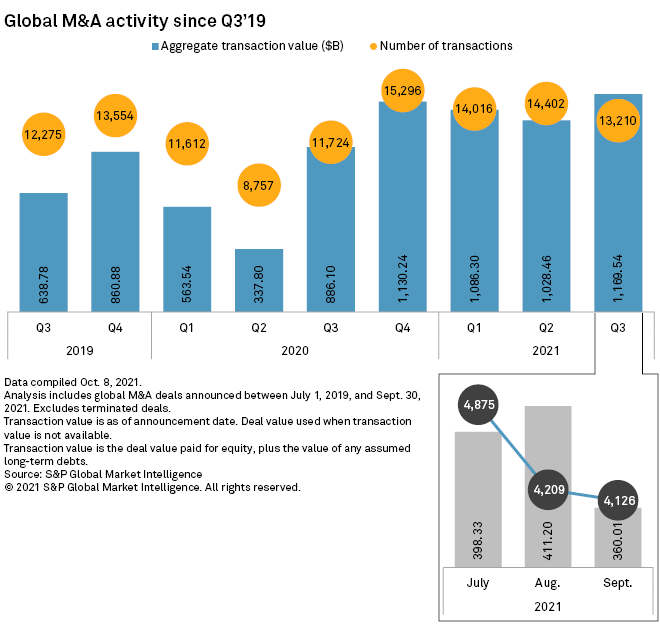 M&A activity continued its unprecedented run during the third quarter as total global announced transaction value increased 13.7% sequentially and 32.0% year over year to $1.170 trillion, according to S&P Global Market Intelligence's latest M&A and Equity Offerings Market Report.