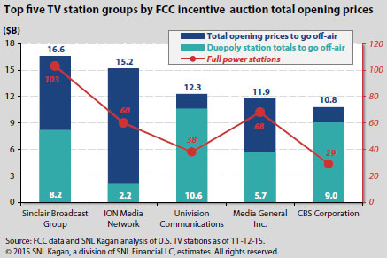 The trick is deciding what stations are worth, since as Tribune Media Co. President and CEO Peter Liguori said on Nov. 11, "Opening bid prices in this kind of an auction are irrelevant," referring to the descending clock format. Our chart shows the total opening prices for the top 5 station owners by opening price totals, with the total opening price totals for duopoly stations (the ones more likely to be tendered) also shown.