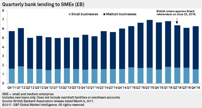 Against that backdrop, new bank loans to SME customers fell in the second and third quarters of 2016. A slight sequential rebound in the fourth quarter still left new loan volumes below year-ago levels. The second quarter of 2016 marked the first year-over-year decline in new bank loans to SMEs since the third quarter of 2013, according to data from the British Bankers' Association.
