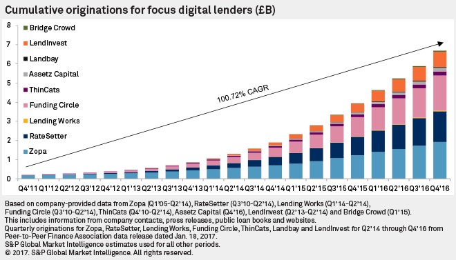 A new report by S&P Global Market Intelligence estimates that as of 2016 year-end, nine key digital lenders in the U.K. had originated £6.69 billion in loans since their respective inceptions. The nine largest platforms covered in our 2016 U.S. Digital Lending Landscape had originated the equivalent of £53.69 billion from their respective inceptions through the end of 2016.
