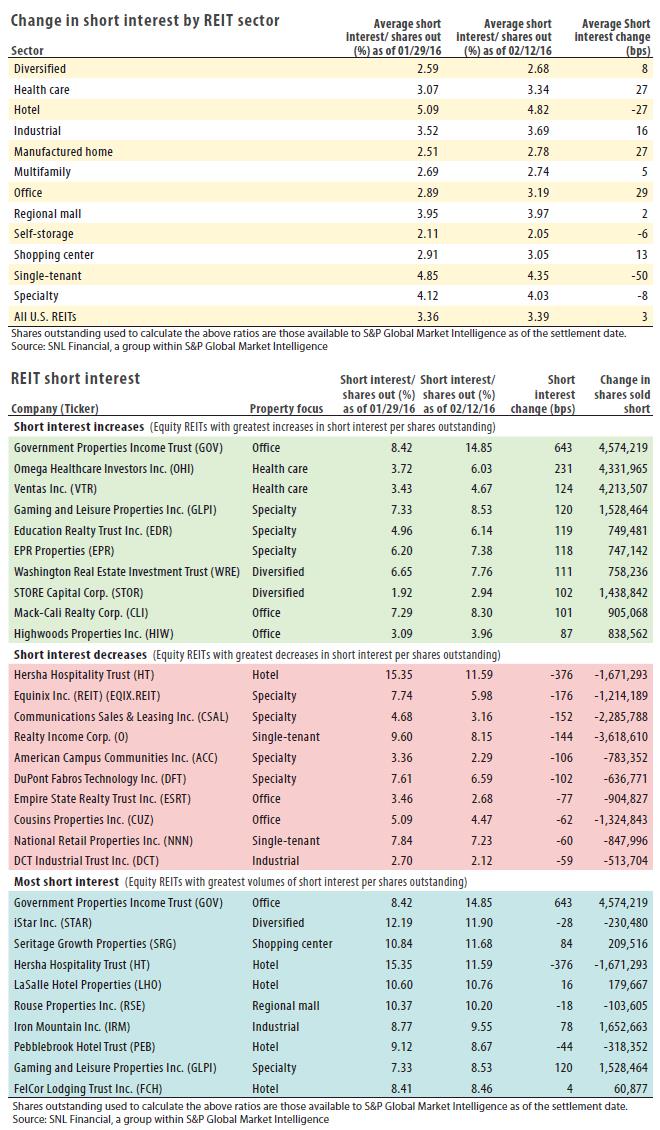 U.S. REITs recorded a 3-basis-point average short interest gain to 3.39of outstanding shares during the first half of February.