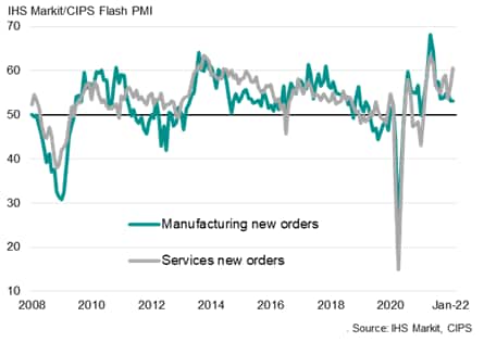 Looking at new orders, which represent the influx of new demand, service sector work inflows hit an eight-month high while manufacturing new orders continued to grow at the slowest rate for a year.