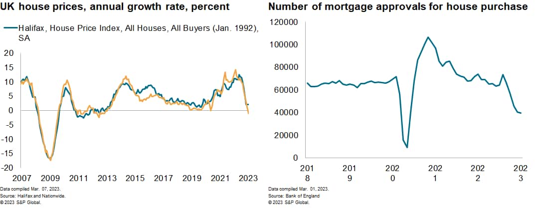 The Nationwide mortgage lender reports that UK house prices have fallen for a sixth month in a row, declining 0.5% between January and February. This was after house prices dropped by 1.8% quarter on quarter (q/q) in the fourth quarter of 2022, which was the first decline since mid-2020. House prices fell by 1.1% year on year (y/y) in February, which was the first annual decline since June 2020 and the weakest performance since November 2012.