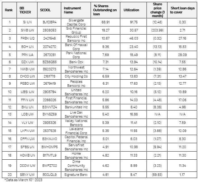 Looking across the sector, short interest in the regional banks remains strong as recent declines in share prices have impacted investor confidence. The top twenty most shorted US Banks (ranked by the percentage of outstanding shares on loan) are listed below.