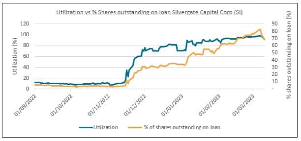 S&P Global Market Intelligence Securities Finance data shows that borrowing activity in Silvergate Capital Corp (SI) gained momentum during November as utilization increased from 10% to 35% overnight on November 16th, 2022. The percentage of shares outstanding on loan reached a peak of 82.4% on March 6th, 2023, just before the bank confirmed that it would be winding down its operations and liquidating its assets on March 8th, 2023.