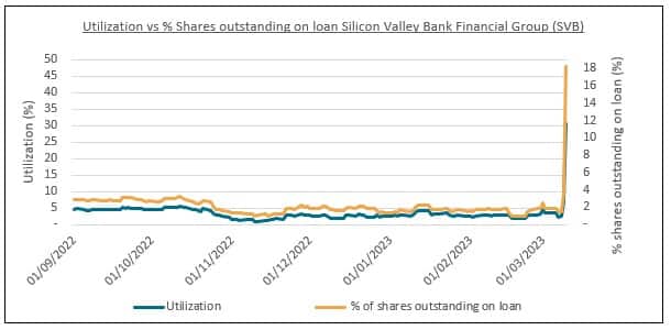 When examining the same metrics across Silicon Valley Bank Financial Group (SVB), the speed of recent events can be clearly seen in the short interest data. Both utilization and the percentage of shares outstanding on loan increased rapidly on March 8th, 2023, as the bank announced its plans to raise capital through the issuance of new equity. On March 10th, 2023, the bank was considered illiquid following a run on its deposits leading to the second largest bank fail in US history.