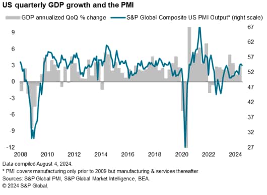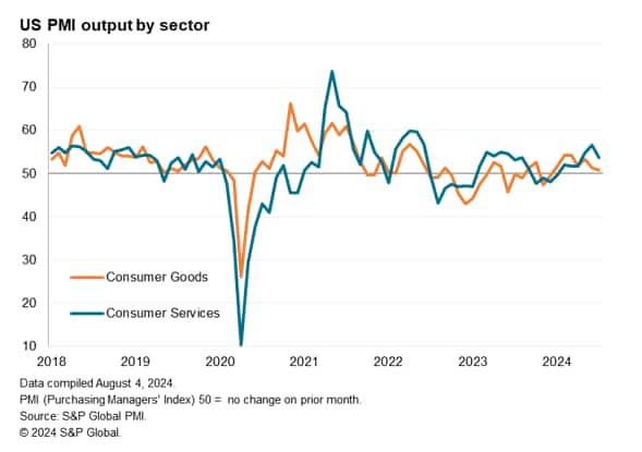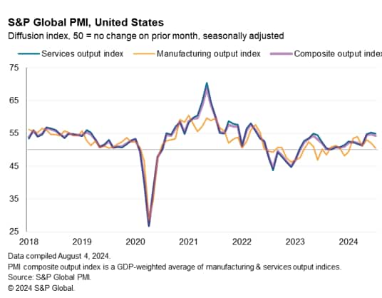 Although the headline S&P Global US PMI Composite Output Index fell for a second month from 54.8 in June to 54.3 in July, the latest reading was the third highest recorded over the past 14 months, and is marginally above the survey's long-run average of 54.2.