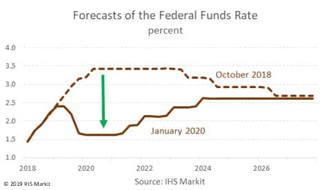 A year ago the Fed had raised its policy rate, the federal funds rate, to nearly 2.5%, and there were widespread expectations, fostered by Fed officials themselves, that the funds rate would rise further. However, during 2019, as downside risks mounted — higher tariffs, spiking trade policy uncertainty, an emerging global slowdown, heightened concerns of a "hard" or "no-deal" Brexit, and possible cuts (or a "sequestration") of federal spending — the Fed unexpectedly reversed course and took out "policy insurance", lowering the funds rate three times by a cumulative ¾ percentage point. The difference between where the policy rate is today and where, a year ago, we expected it to be today, is almost 2 percentage points. Since monetary policy affects growth with a lag, the Fed's policy pivot in 2019 will afford the economy considerable support in 2020.