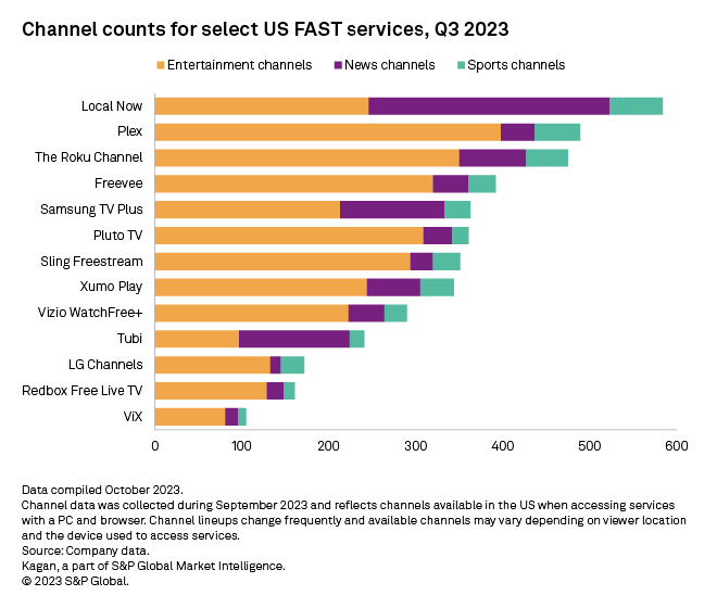 Paramount Global's Pluto TV and Fox Corp.'s Tubi have emerged as the top US FAST services by revenue, although their respective parents, Paramount and Fox, have charted different strategic paths for each service. Pluto TV topped 300 channels over a year ago and primarily relies on entertainment programming. Tubi, on the other hand, leans more heavily into news programming and carries local news channel feeds for Fox stations and from stations owned by Hearst Television Inc., The E.W. Scripps Co., TEGNA Inc. and others.