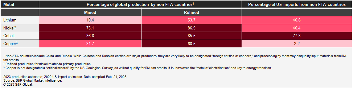 But the challenges of meeting these needs are formidable. Over time, lithium is the mineral most likely to be sufficiently supplied to the US under the IRA's content requirements. Assuring supply of nickel and cobalt that meets rapidly growing US demand will be more difficult. Nickel production is concentrated in non-FTA countries. Enough cobalt will be processed in FTA countries to meet the US's energy-transition demand - but it is exported to other countries.
