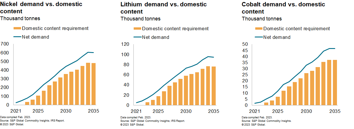 A new S&P Global study - Inflation Reduction Act: Impact on North American metals and minerals market - seeks to ascertain how much the IRA will add to energy-transition demand in the United States. Similar to S&P Global's 2022 report, The Future of Copper, it takes a detailed, bottom-up, technology-by-technology approach to project demand for four metals key to energy-transition applications: lithium, cobalt, nickel, and copper. The first three are inputs to electric vehicle batteries and, as US-listed 'critical minerals,' their use attracts IRA tax credits - subject to sourcing requirements being met. The fourth, copper, is not listed as a critical mineral in the US (although it is in the EU and Canada) but is fundamental to the energy transition as the "metal of electrification." The study then compares projected demand post-IRA to available supply, given IRA rules around sourcing in terms of country of origin for production and processing. Copper is listed as 'near critical in the medium term' in the US Department of Energy's Critical Materials Assessment 2023. This, however, does not render it an applicable critical mineral per the Inflation Reduction Act.