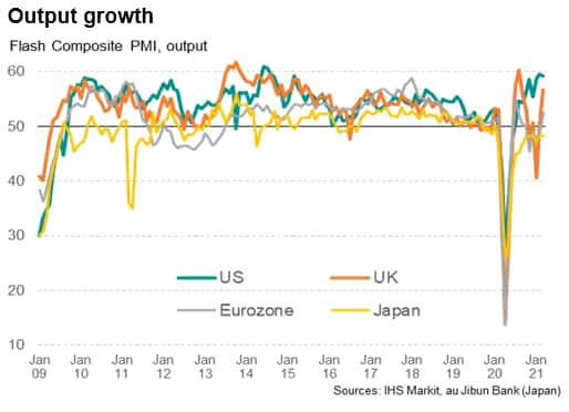 In contrast, optimism relating to vaccination programmes has been far less evident in Japan and, to a lesser extent, the eurozone, contributing to weaker spending on services in particular.