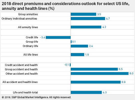 S&P Global Market Intelligence projects overall growth in direct life, annuity and accident and health premiums and considerations of 4.3% in 2018, up from expansion of 1.3% in 2017. By product segment, we project that ordinary individual and group annuities will see combined growth in direct premiums and considerations of 4.2% in 2018, compared to a decline of 3.1% in 2017. This reflects increased optimism for sales following what had been, in some cases, historically low results.