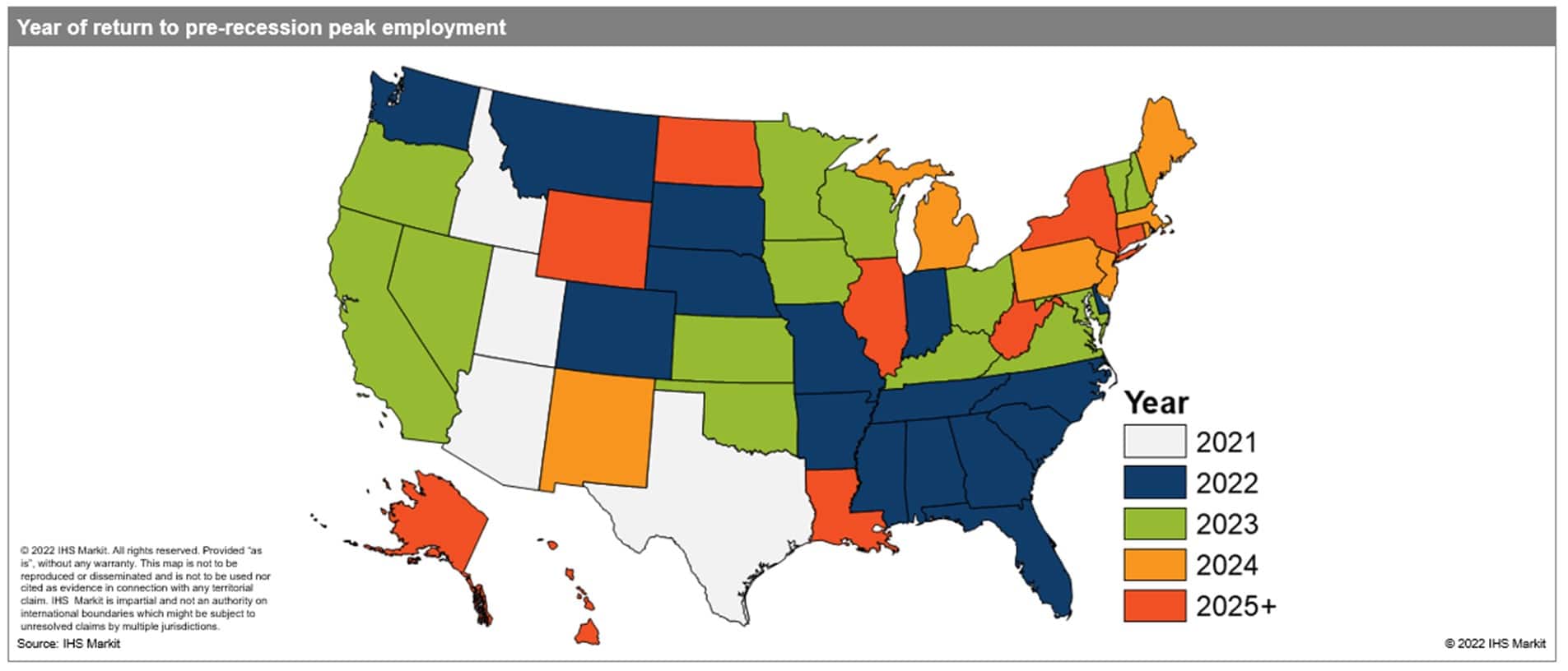 Florida, Georgia, Indiana, North Carolina, Tennessee, and Washington are the biggest states in that cohort. The South has an outsized representation among the soon-to-be recovered given the dynamics around the pandemic and the fact that it is historically a faster-growing region. At the other end of the spectrum, densely populated cities had a harder time through the pandemic, and there are many in the Northeast, Midwest, and West Coast. Those regions struggled more in their recoveries. As a result, Texas, Florida, Georgia, and North Carolina will recoup their employment losses by the end of 2022, while California, New York, Pennsylvania, Illinois, Ohio, and Michigan will not. Their recoveries will span into 2023 or longer.