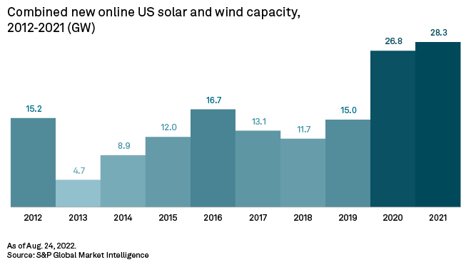The Inflation Reduction Act tax credits are designed to phase out once emissions from the power sector fall to 25% of 2022 levels, though not before 2032. In an Aug. 10 preliminary analysis of the act, the power and renewables team at Commodity Insights estimated that the U.S. would have to build the equivalent of 1,200 GW of additional solar and wind capacity to meet the 25% trigger. In other words, the U.S. would have to deploy the equivalent of 120 GW of new solar and wind capacity each year over the next 10 years for the tax breaks to expire in 2032. For perspective, from 2012 through 2021, an average of 15.2 GW of combined solar and wind capacity came online each year in the U.S., based on Market Intelligence data.