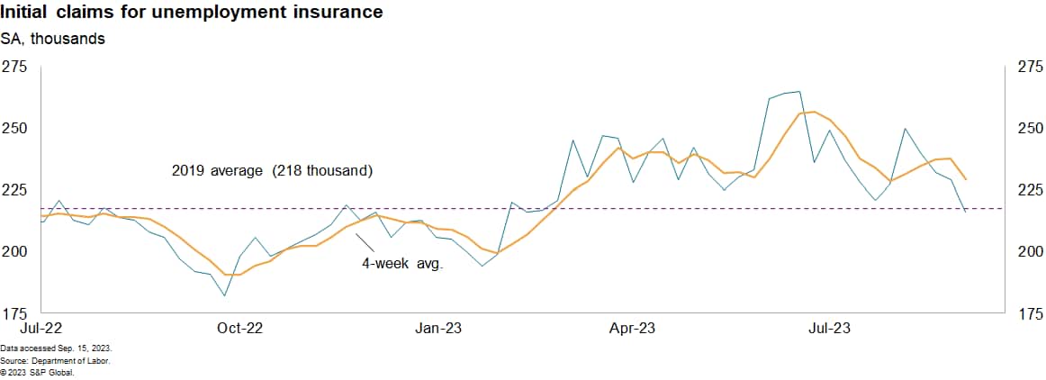 Exceptionally tight conditions in the labor market largely remain. In the latest week, initial claims for unemployment insurance declined for the fourth consecutive week and continuing claims edged lower as well; both now sit below their 2019 average. Last week's report that the unemployment rate rose in August was not a sign of labor market cooling, although there are hints of cooling: Previously reported data show material declines in job vacancies, indicating labor demand may be softening without it necessarily being reflected in job losses. Still, wage gains exceed a rate consistent with 2% inflation, so some degree of increased labor-market slack is likely needed to slow wage gains.