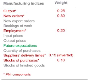The headline manufacturing PMI aggregates five survey indicators (sub-indices) into a single-figure diffusion index to provide an overall barometer of manufacturing business conditions.