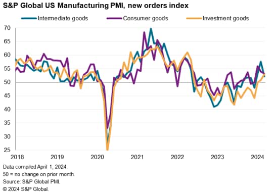 By product type, the upturn in new orders has become more broad-based and importantly, now also encapsulates the previously-lagging investment goods sectors (which produce capital equipment such as such as plant and machinery). Having seen a steeper drop in demand compared to consumer goods and intermediate goods in 2023, investment goods producers reported the largest rise in new orders for 22 months in March, the rate of increase only marginally exceeded by that seen for consumer goods.