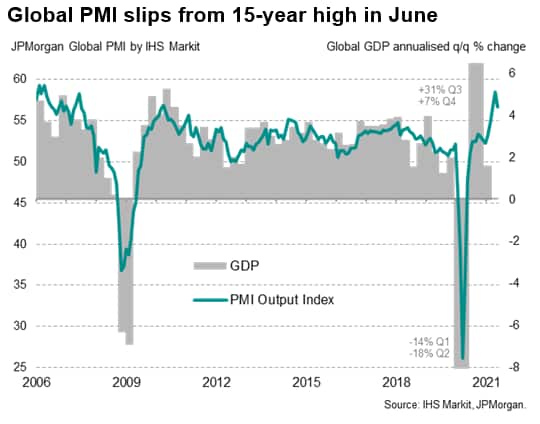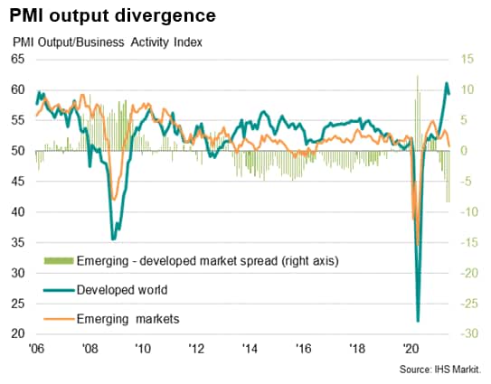IHS Markit's PMI business surveys showed the global economic recovery losing slight momentum in June. Regional differences remained marked, however, underscoring the impact of COVID-19 vaccination progress as rising virus waves continued to hit many countries, notably in Asia. The emerging markets consequently underperformed the developed world in the second quarter to a degree not previously recorded over the survey's 23-year history.