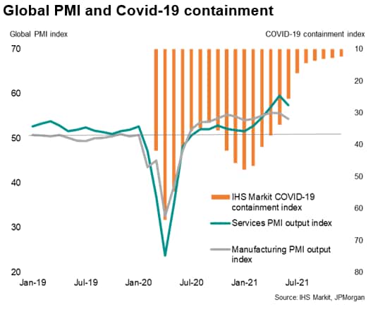 The outperformance of the service sector throughout the second quarter has coincided with COVID-related restrictions easing globally on average to the lowest since the pandemic began, albeit with marked variations by region.