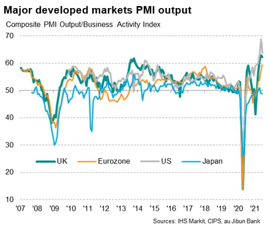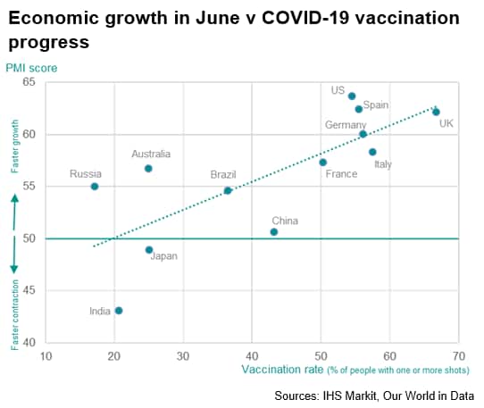 The strong developed world expansion is even more impressive when one considers that Japan saw business activity fall for a second month running in June. A rising wave of infections led to a further contraction of service sector output and a near-stalling of factory output growth. More encouragingly, future optimism in Japan jumped to an eight-year high, suggesting that growth will soon pick up as Japan's vaccine progress gathers greater coverage.