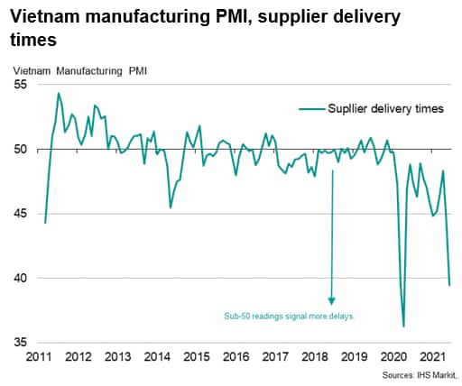 Output and new orders both decreased at the sharpest rates since the first outbreak of the pandemic in early-2020, while firms scaled back their employment and purchasing activity accordingly. The pandemic also impacted supply chains, resulting in a near-record lengthening of delivery times. For example, four industrial parks in Bac Giang province in northern Vietnam were temporarily closed in late May, due to outbreaks of COVID cases, which also impacted on some manufacturing facilities of Foxconn and Samsung.