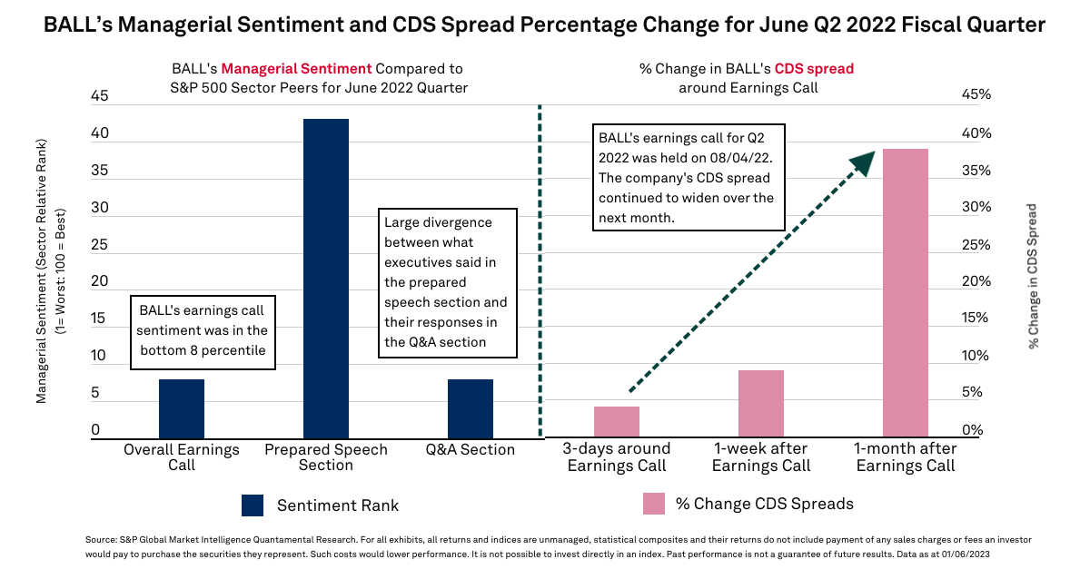 The effect of earnings call sentiment on equity prices is well documented.[1] However, issues that impact the credit risk of companies are discussed on earnings calls as well. For example, on Ball Corporation’s (NYSE: BALL) Q2 earnings call held on August 4, 2022, the company’s CFO said, “the earnings impact of volume deceleration and a higher use of working capital have led to lower-than-anticipated operating cash flow”. Credit facilities are repaid from cash flows and debt covenants typically include leverage provisions tied to earnings (e.g., debt / EBITDA) to protect the lender’s interests. BALL’s Q&A section sentiment score was in the bottom decile of earnings calls for all the companies in the S&P 500 materials sector (Figure 1, left chart)[2]