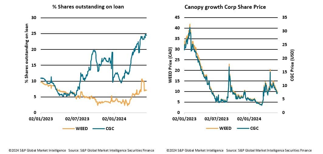 Canopy Growth Corp (WEED Canadian line and CGC US line) was once Canada's most valuable marijuana company with a market capitalization of $25B at its peak. This has now shrunk to $557M. The company recently announced a follow-on equity offering of $250M, to spend on acquisitions, working capital and general corporate purposes. This news sent the company's share price lower by 7.6%. Short Interest continues to climb in the stock, recently reaching its highest level since 2023, as a lack of profits, due to the high costs associated with the level of regulatory compliance needed to produce the product, continue to weigh on both the company and the broader sector. To the end of May 2024, lenders of the stock have received $57M in securities lending fees.