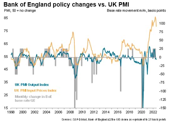 With a 50bp August rate hike already priced in, the focus shifts to the future policy path. Our forecasters here at S&P Global Market Intelligence expect further 25 bp hikes in September, November and December, as well as in February 2023, taking the policy rate to a peak of 2.75%, reflecting the anticipated stickiness of elevated inflation in the UK. Although PMI data have indicated a tentative peaking in price pressures, household energy prices are expected to rise sharply into the winter, keeping inflation uncomfortably above the bank's 2% target and adding to fears of a wage-price spiral.