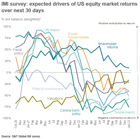 Risk appetite and expected near-term US equity market returns remained in negative territory in the opening trading sessions of 2023, albeit improving from December. Furthermore, the greatest perceived drag on the market is now viewed to stem from central bank policy, overtaking the global macroeconomic environment as the biggest concern.