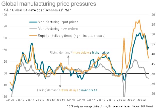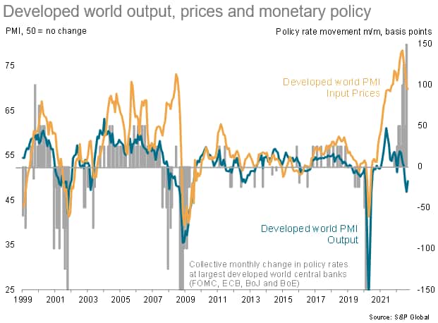 October flash PMI data will provide key insights into recession risks for some of the world's major economies. Prior data showed global output dropping for a second successive month in September amid worsening worldwide demand linked to the escalating cost of living, tightening financial conditions and rising risk aversion. However, this slowdown is also exerting downward pressure on many prices, which could in turn drive speculation about monetary policy needing to be tightened less than previously anticipated. However, it is evident that trends vary by region. Read more in our special report on page 4.