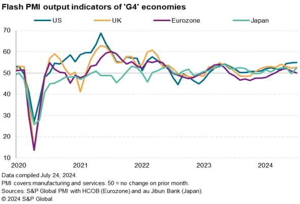 Flash PMI data provided mixed news on economic trends in the major markets. US growth accelerated to the fastest since April 2022, outpacing the other 'G4' major developed economies for a third successive month. Growth also rebounded sharply in Japan after a brief decline in June, posting the joint-largest expansion seen over the past year. Robust growth was likewise seen in the UK, the pace of expansion reviving after a lull that was often attributed by companies to paused spending ahead of the General Election.