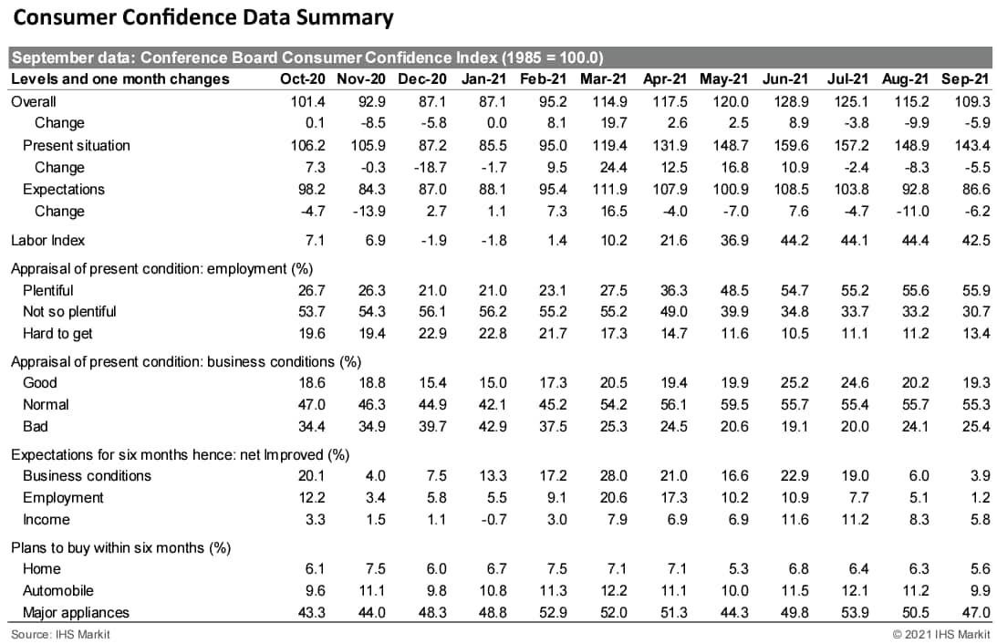 - The US Conference Board Consumer Confidence Index decreased by 5.9 points (5.1%) to 109.3, following declines in July and August. The index is at its lowest level since February. The index of views on the present situation declined 5.5 points to 143.4. The expectations index fell 6.2 points to 86.6. (IHS Markit Economists James Bohnaker and William Magee)