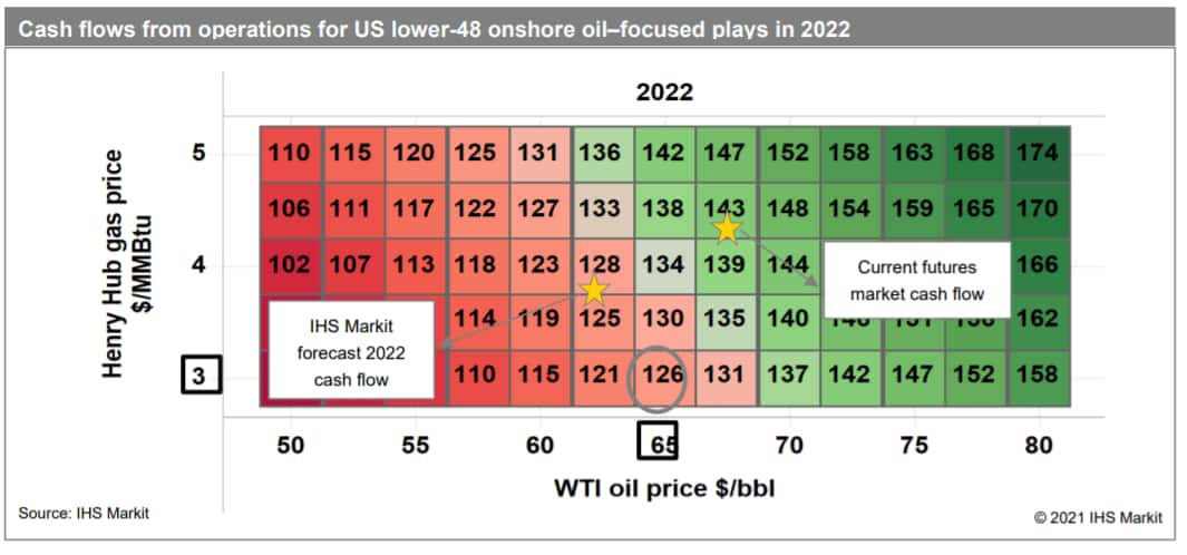 - The IHS Markit 2018 cash flow estimate for US lower-48 onshore oil-focused plays (using actual prices of $64.91/bbl WTI and $3.13/MMBtu HH) was $97 billion.