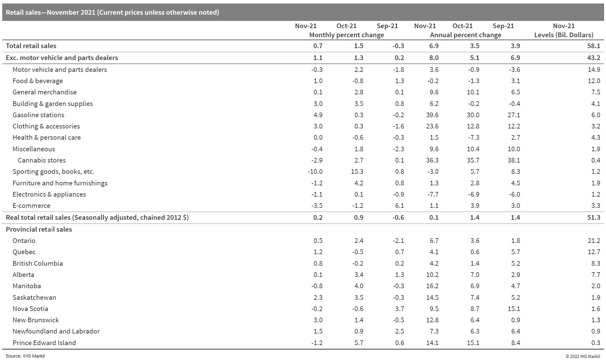 - Fully capturing the effects of the Omicron variant and flooding in British Columbia, preliminary data suggests sales fell 2.1% m/m in December.