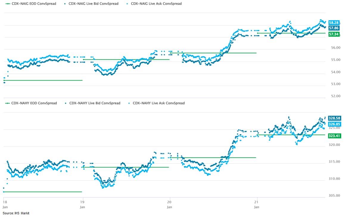 CDX-NAIG closed 58bps and CDX-NAHY 326bps, which +5bps and +21bps week-over-week, respectively.