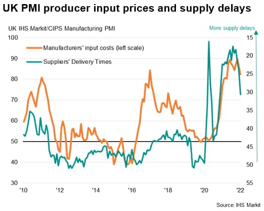 - Manufacturing output growth meanwhile ticked up to the fastest since August as alleviating supply constraints allowed factories to stem the recent rapid growth of backlogs of uncompleted orders. Suppliers' delivery times lengthened to the least extent since November 2020.