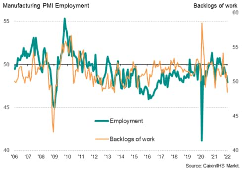 - Ominously, the January survey also showed that the drop in new orders caused backlogs of uncompleted work to fall at a rate not exceeded since the height of the global financial crisis in 2008-9. This depletion of manufacturing order books hints at the build-up of excess capacity relative to demand, and in turn caused increasing numbers of firms to scale back workforce headcounts. The resulting decline in factory employment was the largest recorded since the early stages of the pandemic in April 2020.
