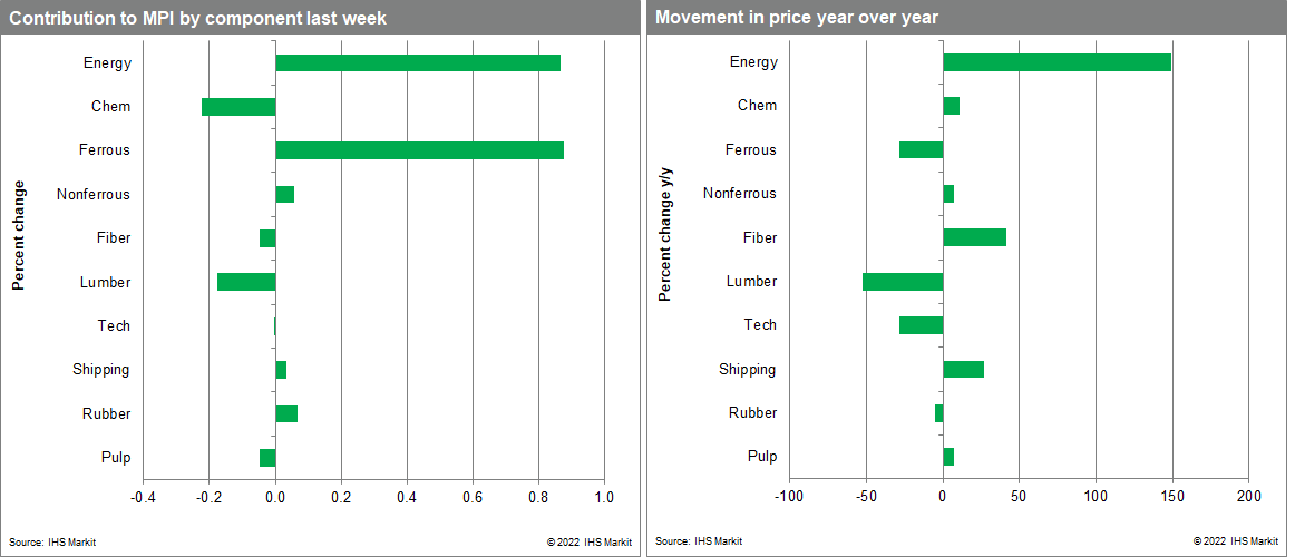 Our Materials Price Index (MPI) rose 1.4% last week, reversing the declines recorded during the previous week. Exactly half of the ten subcomponents in the MPI increased: evidence of the uncertainty permeating markets at present. That said, the general direction of commodity prices has been down over the past two months with the index now 12.3% lower than its all-time high established in early March.