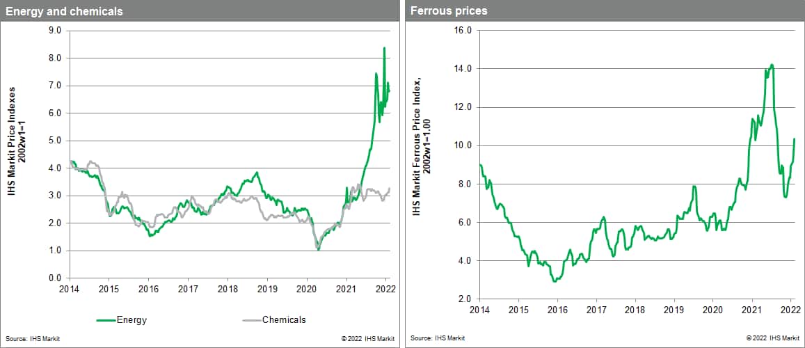 Industrial metals prices soared last week. Our ferrous sub-index was up 7.7% as iron ore prices reached $151 per tonne after the Chinese government announced an easing of its environmental targets. The deadline for peak carbon emissions was shifted back to 2030 from 2025, which boosted the Chinese steel demand outlook. Nonferrous metals also had a strong week with the sub-index climbing 2.5% after broad price rises. Aluminum prices hit a 34-year high of $3,312 a tonne as supply tightened. Smelters are being impacted by high electricity prices Europe and in China by the effects of China "Dual-Control" and zero-COVID policies. Geopolitical tensions are also taking a toll -- Russia is a major commodity producer with elevated risk premiums now being priced into many markets. Prices for lumber also rose strongly with our sub-index recording a 19% gain. Supply was already constrained due to mudslides in British Columbia, (which provides 14% of total US lumber), which blocked deliveries. However, housebuilding demand remains strong and buyers last week took the opportunity to replenish inventories ahead of peak construction season in the spring.