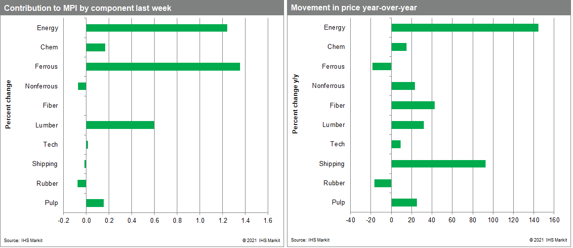 Iron ore, energy, and lumber price increases were most notable last week. Our ferrous sub-index was up 4.5%, a third consecutive weekly increase. Iron ore prices reached $108 per tonne as markets reacted positively to strong import figures into mainland China. Official data showed that iron ore imports increased 14.6% from October to November which was interpreted as a sign that steel demand would increase in early 2022. However, the Chinese economy is facing major headwinds (with the potential collapse of major developer Evergrande a real threat) which will likely reduce the need for steel. Our energy sub-index was up 5.7% last week as the crisis in European natural gas markets continues. Inventory levels in Europe are currently 10% lower than seasonal norms and exports from Russia remain low by historic standards pushing UK spot landed prices of liquefied natural gas (LNG) to $34/MMBtu, up from $30 the previous week. With little change expected this winter, elevated prices could last well into the summer. Prices for lumber also rose strongly with our sub-index recording a 15% gain. Mudslides in British Columbia, which provides 14% of total US lumber, have blocked deliveries; and the Biden Administration's doubling of tariffs on Canadian imports has triggered a fresh spike in prices.