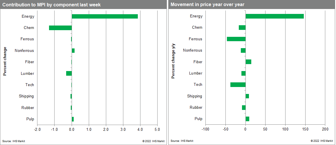 A rise in energy prices pushed the overall MPI higher. Non-energy prices were in fact down by 2.2% last week. However, natural gas and coal both increased significantly, with the energy sub-index climbing 12%, its biggest weekly increase since late February in the immediate aftermath of Russia's invasion of Ukraine. UK spot landed prices of liquefied natural gas (LNG) reached $44/MMBtu, up $29 for the week. US prices also increased with Henry Hub reaching $8.60/MMBtu, a 10% gain. Prices were reacting Russia's announcement that it would reduce gas flows through its Nord Stream 1 pipeline, the major source of its exports to Europe, to 20 per cent of its capacity. This has raised fears of widespread shortages in Europe this winter. The potential reduction of gas supply heightened interest in alternative energy sources and sent Australian thermal coal up $14 to $426 per metric ton, its highest ever price. Overall, global coal prices climbed 4.9% last week. Industrial metals also rebounded with the nonferrous metal sub-index up 2.5%. Copper prices rose to $7,800 per tonne, having been as low as $7,200 per tonne the previous week. Base metal prices reacted to a slightly weaker US Dollar, the promise of additional infrastructure spending by mainland China, and a continuing decline in inventory.